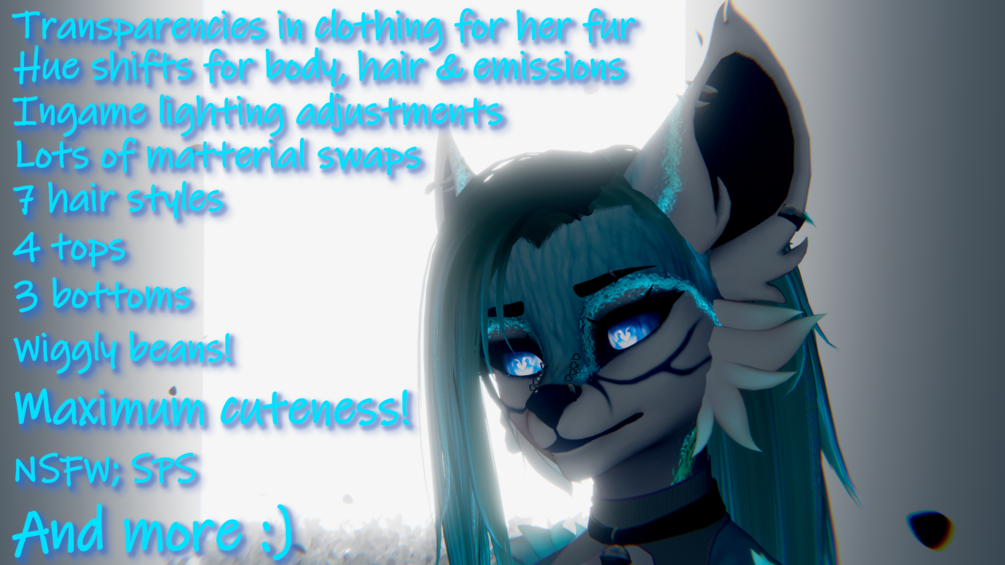 Please do not buy this avatar with the intention of turning her into a quest compatible one. I'm making use of transparencies for textures and UV discard for toggles and other things. I'm also not using any material swaps for colors! It's all done through dissolve and decals which also will not work on a quest headset!